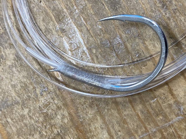 従来の仕掛けでは針を結ぶ事により、ハリスの直線強度が低下します。