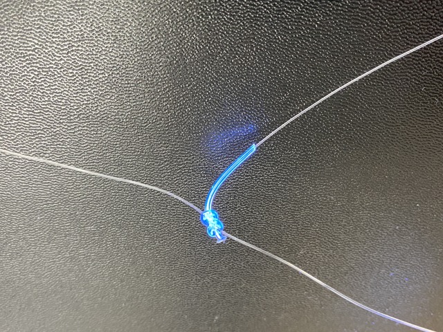 針に餌ズレ防止の餌止めと集魚剤効果のケイムラ糸巻き